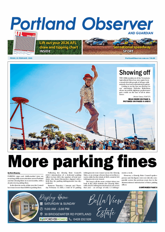 Portland Observer – 20th February 2026 Subscribe or Login to see the rest of the content. Username Password * Remember Me Forgot Password News Toe-tapping tribute to an icon 19/02/2026 A MAN who played to south west crowds many times was bid farewell by 600 people at the Alice Springs Convention Centre on Tuesday... Cricket hits final round 19/02/2026 PORTLAND Colts will carry strong momentum into their must-see clash with Pigeon Ponds in the final round of the Hamilton District Cricket Association’s season,... Last round of touch football ahead of finals 19/02/2026 PORTLAND Touch Football Association played out its last round before finals began last night with some big wins in round 16 setting sides up. Blue...