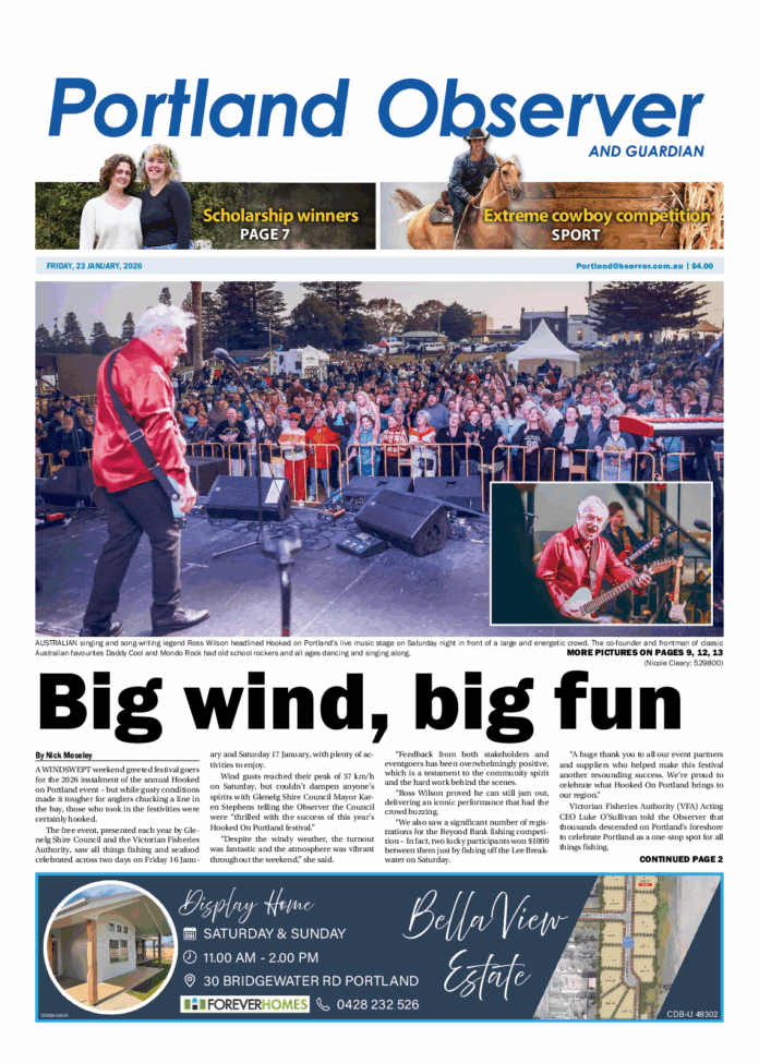 Portland Observer – 23rd January 2026 Subscribe or Login to see the rest of the content. Username Password * Remember Me Forgot Password News Second Chili Bowl serve for Storer 23/01/2026 WHILE speedcar drivers aren’t known for their ability to do things slowly, local racer Luke Storer’s start to 2026 has barely given him the... Nelson Regatta hits the water 23/01/2026 THE return of the Nelson Regatta has finally arrived with the events set to make a big splash across the next four days after... Big wind, Big fun 23/01/2026 A WINDSWEPT weekend greeted festival goers for the 2026 instalment of the annual Hooked on Portland event – but while gusty conditions made it...