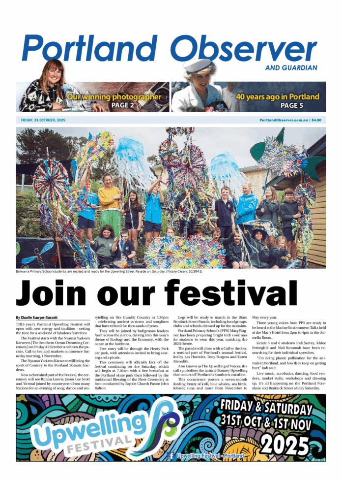 Portland Observer – 31st October 2025 Subscribe or Login to see the rest of the content. Username Password * Remember Me Forgot Password News Sammy sticker honours our special visitor 04/11/2025 Portland’s beloved elephant seal, Sammy, has been immortalised with his very own sticker, thanks to the creative talents of local artist Jo Reid. ... Locals treated to water tour 04/11/2025 THE intricacies of Wannon Water’s drinking and waste water processes wowed groups of local residents who experienced the site’s sights, and some aromas, as... Mostly smooth sailing for PYC on Sunday 03/11/2025 PORTLAND Yacht club were treated to splendid sailing conditions as Sunday 26 October proved to be a great day for club members who took...
