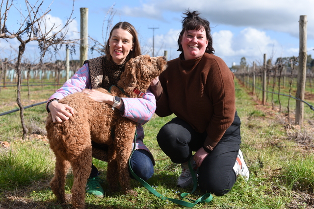 Coonawarra Walking Trail Woof and Wine Walk event organisers Sally McDonald and Matilda Innes look forward to seeing many pups at the first ever Woof and Wine Walk event. Participants will wander through six Coonawarra wineries as part of the new experience with their four-legged friends while enjoying tastings, food and entertainment for the pups and themselves, on Saturday 11 October 2025. (Kate Jaensch 496928)