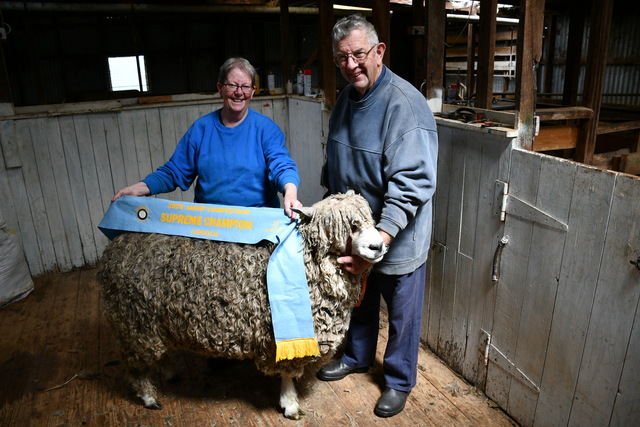 Rae and Ian Christie with their 2025 RAS prize winning Lincoln ram, a 116 kilogram, July 2022-drop ram.