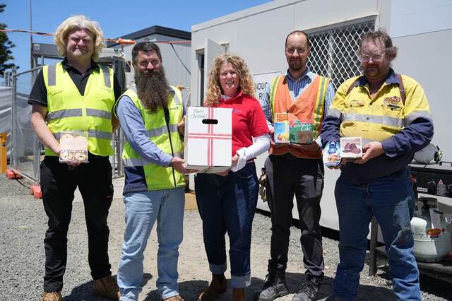 Excited to give away Christmas hampers are (from left) Andrew Thomas – Tutt Bryant Hire, David Courtot – Project Manager, Nicole Carr - United Way Glenelg, Jason Whyte – Berry & Whyte Surveyors, Tom Wilson- S&S Excavations.
