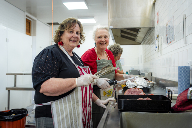 Sue Anson (left) and Rhonda Franks preparing the roast. (Karen Hodge; 525670)