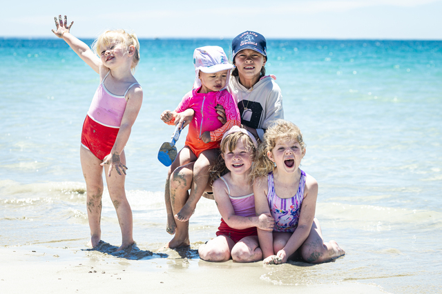 Families who travel for work get to enjoy some beautiful places and these children can vouch for that. Enjoying Nuns Beach, Portland are (from left) Myla Blades, 3, Waiaria Martin, 10, from New Zealand with cousin Goldie Hippolite, one and a half, Emmy Blades, 5, and Darcy Draper, 5 who is from the UK. The Hippolite and Blades girls are travelling with the Portland Family Carnival. (Karen Hodge; 527308)