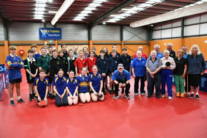 Portland Secondary College, Bayview College, Baimbridge College, and Good Shepherd College Table Tennis players join the Hamilton Keen-Agers for a photo. (Ciaran Thow: 504094)