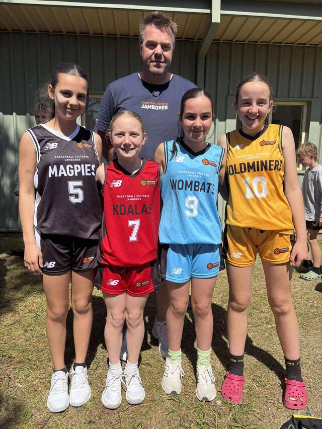 Portland basketballers recently took part in the under 12 Basketball Victoria country Jamboree. From left: Annabelle Barr, Peyton Marshall, Leigh Wiseman (coach), Stevie Yuill and Tully Carter. (Supplied)