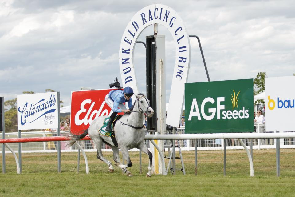 Jockey Will Gordon rides Le Zebra across the finish line to win the 2025 Dunkeld Cup. (Cathy Norris: 517787)