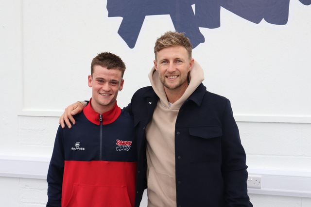 Gorae-Portland cricketer Tom Roberts had the chance to catch up with English cricketer Joe Root while in the UK. (Supplied)